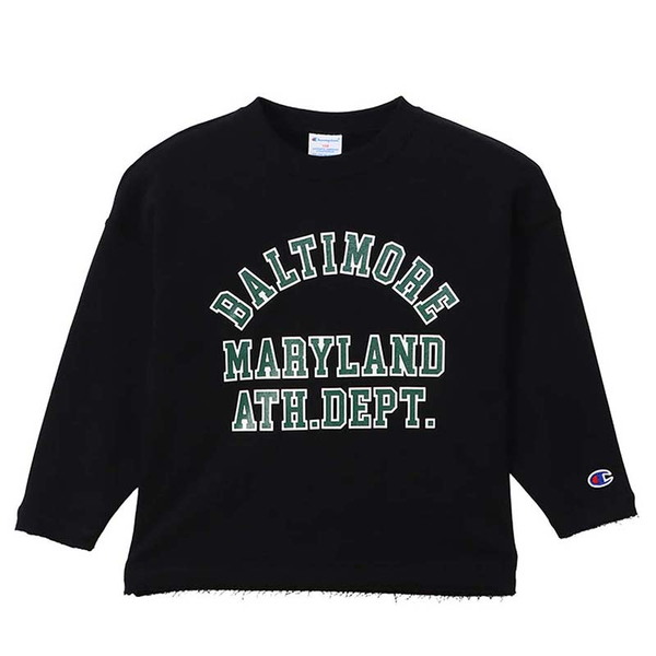 • 前身頃のプリントはチャンピオンブランドと親和性の高いカレッジ風グラフィックを現代に落とし込んだもので、アメリカの地名をアーチ状にデザインし、シリコンラバープリントで表現しています。