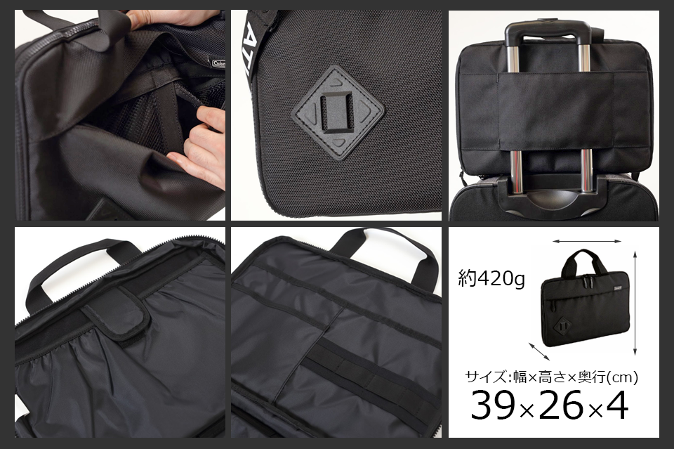 出張などが多いビジネスマンの心強い味方♪キャスターバッグに取り付けれるようになっていたりガバッと大きく開口するので荷物の出し入れも便利★オーガナイザーも充実!デザインもシンプルなのであって損なしバッグです。