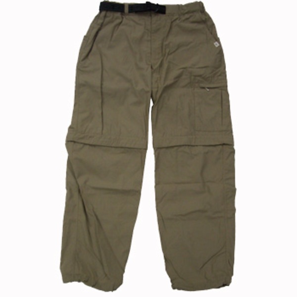 サラッとした薄い生地です。 ポケットは前左右、後左右(マジックテープ開閉)、左カーゴポケット(ファスナー開閉)の5つです。 ベルトはゴムで、モノトーンの模様入り。裾は内側スピンドル仕様です。