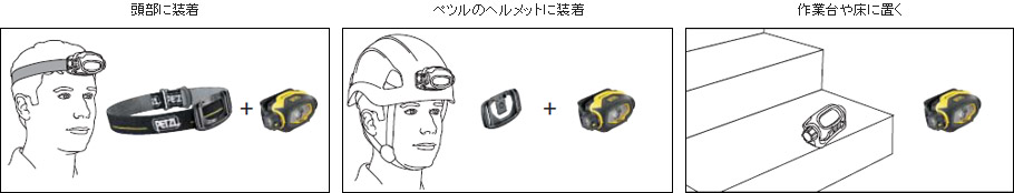 作業現場でのニーズに合わせて、伸縮性ヘッドバンドで頭に装着したり、付属のアタッチメントプレートを使用してヘルメット『バーテックス』や
